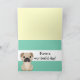 A Birthday card featuring a simple digital illustration of a cute pug learning in and saying "Hey! I heard it's your Birthday!" on a green background. The inside is a lighter yellow and has the little pug again next to the text "Have a wonderful day!" All the text on the card is fully customisable so you can make it as personal as you'd like.
