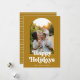 Une carte de vacances rétro votre photo en forme d'arc, et "Happy Holidays" en gras de type rétro blanc, sur un arrière - plan jaune moutarde/or. L'envers est constitué de bandes horizontales blanches.