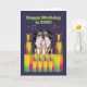 Very cute black and white dog chanté joyeux anniversaire. There est un colorful back ground of birthday cakes.