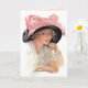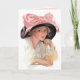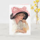 Jeune femme sirotant un soda tout en portant un grand casquette noir avec grand arc rose. Une magnifique scène vintage.