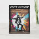 Carte d'anniversaire sur le thème du skateboard, avec l'image d'un mur en brique décoré d'art urbain. La photo murale est d'un skateboarder avec des éclaboussures de couleur vive derrière lui. Les mots "Joyeux anniversaire" sont en haut de la carte, ainsi qu'à l'intérieur.