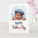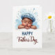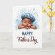 This card shows a peaceful infant sleeping with warm skin tones, rosy cheeks, and tiny features, eyes closed and lips slightly parted as if mid-dream. A light blue cap with gentle folds sits snugly on the baby’s head, while chubby arms tuck under the chin on a soft white blanket that looks like a little cloud. Above the head, pale blue circles and a few thin dark lines spread outward like quiet rays, adding a calm, dreamy setting that feels tender and close, like someone nearby is watching with a caring gaze 👨. Below the illustration, the message is centered, with “HAPPY” in medium-to-dark blue letters and “Father’s Day” written beneath it in a deep reddish-brown flowing style. The text sits on open white space so the baby remains the focus, and the color pairing keeps the mood gentle rather than loud. Small details like the soft shading on the cheeks and the smooth highlights on the cap give the scene a cozy, affectionate look, like a shared moment between parent and child. A tiny nod to dad-life comes through in the relaxed, at-home feel, as if a 🚗 ride or a quiet afternoon just ended. Near the baby’s head, the pale blue circles fade into the white background while the thin dark lines point outward in a simple sunburst pattern.