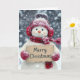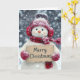 Un joyeux bonhomme de neige, aux oreilles rouges, casquette et foulard assorti, porte une pancarte sur laquelle on peut lire "Joyeux Noël" au milieu d'un arrière - plan enneigé. Le texte intérieur peut être modifié.