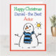 Joyeux Noël à un acteur. Drôle dessin d'un bonhomme de neige au soleil d'hiver. Ajoutez un message de l'expéditeur.