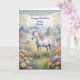 Envoyez des voeux pour un anniversaire magique. Souhaitez à votre soeur un joyeux anniversaire de licorne. Une image rêveuse d'une licorne blanche avec un arc-en-ciel principal debout dans un champ de fleurs. dans l'arrière - plan sont des montagnes majestueuses.La carte parfaite pour donner à ceux qui aiment les licornes magiques et mystiques.