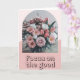 Send a gentle reminder of positivity with this aesthetic inspirational card. It features a beautiful photograph of a dusty rose and blush pink floral bouquet set in a modern arched frame. The bottom is anchored by the motivational quote, "Focus on the good," rendered in a trendy, slightly retro, groovy font. This design is perfect for thinking of you notes, encouragement stationery, or a simple uplifting gift for a friend or family member. The soft, feminine pink color palette and elegant flowers make it an ideal choice for women and teens who love modern aesthetic and positive affirmations.