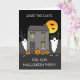 Une simple illustration d'une maison hantée la nuit, avec des fantômes, des chauves-souris et des citrouilles lanternes à l'extérieur. Les mots 'Sauvez la date pour votre soirée Halloween' accompagnent l'image.