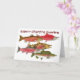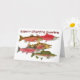 Carte humoristique comportant 5 espèces des saumons nord-américains tout montrés en engendrant le régalia. Saumon rouge, Chinook, copain, Coho et bosse. De l'aquarelle originale étudie par nature l'artiste, Thom Glace.