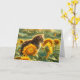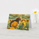 Une carte de solstice d'été avec un chat orange rayé mignon regardant un papillon dans un champ de tournesols d'été.