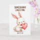 This greeting card features a white bunny on a plain white background, drawn with a soft, watercolor-like look. The bunny has its eyes closed, a big happy smile, and light pink blush on its cheeks, which makes it feel warm and affectionate. It’s holding a shiny pink heart in its small paws right at the center of the card. Above the bunny, the text “SOMEBUNNY LOVES YOU” curves in a hand-drawn style, like casual lettering. Below the bunny, “AND IT’S ME!” appears in the same hand-drawn look, sitting near the bottom as a sweet little punchline. The pink heart and the bunny’s rosy ear details add a gentle pop of color that fits the Valentine’s theme ❤️