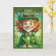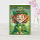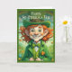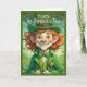 🍀Une jeune fille joyeuse déguisée en lutin rayonne d'excitation, tenant un cadeau doré magnifiquement emballé. Elle porte une tenue verte vibrante, avec un chapeau haut de forme orné de trèfles, un nœud papillon et des boutons dorés. L'arrière-plan capture une scène de ville festive avec des confettis dans l'air, renforçant l'esprit joyeux de la Saint-Patrick. L'image irradie chance, bonheur et célébration.✨