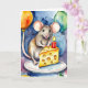Mignonne souris avec une bougie d'anniversaire rouge dans une tranche de fromage et des ballons de fête. Le texte intérieur est modifiable.