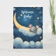 Mignonne souris grise dormant dans un nuage avec une lune en croissant sur un ciel bleu foncé. Tout le texte peut être modifié.