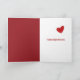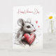 Une souris lunaire s'accroche à un grand coeur rouge entouré de petits coeurs et de lignes peu claires. Le texte peut être modifié.