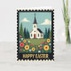 This greeting card shows a spring countryside scene framed like an old postage stamp with tiny edge notches and a lightly worn texture. In the center sits a small white chapel with a dark steeple topped by a cross, and a red front door that feels like an open invitation for friends to step inside together. Deep green evergreen trees cluster around it, set against a calm blue sky with rounded, soft clouds. The foreground is a rolling meadow packed with big golden-yellow blooms, coral-red flowers, and small white star-shaped blossoms, with extra pink and orange touches scattered between 🌷. The colors are bright but gently muted, giving the scene a cozy, affectionate look, as if the landscape is leaning in to welcome you 🐇. Near the bottom, the words “HAPPY EASTER” sit centered in large golden letters with a slightly grainy texture. The chapel’s red door stands out beneath the steeple, framed by flowers that crowd the lower edge like a natural border.