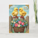 This card features two fluffy yellow fledgling birds perched on the braided handle of a woven basket, leaning close as if sharing a quiet, affectionate moment 🐇. Their tiny dark eyes and small red beaks and feet add crisp accents against the soft yellow feathers, drawing your gaze right to their almost beak-to-beak pose. Below them, the basket brims with spring flowers, including deep pink blooms with golden centers, clusters of white blossoms, and small blue five-petaled flowers tucked among green leaves 🌷. A rustic wooden fence runs across the background, grounding the scene beneath a pale blue sky with light, wispy clouds. An ornate golden border frames the illustration, giving it a classic, keepsake look without feeling fussy. In the upper right corner, the words “Easter Greetings” sit neatly in a small, dark font that stands out against the sky. The woven basket shows tight, interlaced strands, and the handle curves upward in a gentle arc beneath the birds.
