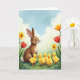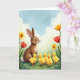 This design shows a brown rabbit sitting calmly in the middle of a spring meadow, watching four fluffy yellow ducklings gather close as if drawn in by a gentle friendship 🐰. The rabbit’s dark, alert eyes and upright ears face the little group, while the ducklings form a loose half-circle with orange beaks and feet turned toward it, like they’re sharing a quiet moment together. Around them, fresh green grass fills the foreground with tiny white and pale yellow wildflowers scattered between the blades. Taller flowers rise behind the animals, mixing sunny yellow blooms with red tulips that frame the scene like a garden border 🌷. Across the top, a short Easter greeting sits centered in soft lettering, set in a warm pastel tone that stands out against the sky. The background sky fades from light blue overhead to a creamy glow near the horizon, with rounded clouds drifting across. Golden light falls evenly across the rabbit’s fur and the ducklings’ down, and the red tulips lean slightly inward from both sides.