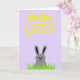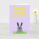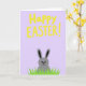 This card features a soft lavender background that sets a gentle springtime scene 🌷. Near the top, a large seasonal greeting appears in thick, hand-drawn yellow letters, centered and easy to spot. The lettering has slightly uneven edges, giving it a friendly, casual look, like a note shared between close friends. Below the words, a small gray rabbit peeks up from a strip of bright green grass 🐰. Its round eyes and tiny curved smile suggest a shy, affectionate hello, as if it’s looking up at someone it trusts. The grass is drawn with tall, pointed strokes that reach upward and frame the rabbit like a cozy hiding place. The overall layout stays open and simple, with the yellow text floating above and the rabbit nestled in the green at the bottom against the lavender field. The rabbit’s ears stand tall above the grass, with the yellow greeting hovering overhead on the purple background.