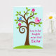 This design shows a stylized spring scene with a brown tree at the center, its arching branches dotted with fresh green leaves and two fuchsia blossoms with yellow centers. A pale blue sky sits behind the tree, fading into a rich green hillside that suggests new growth 🌷. On the left branch, a plump sky-blue bird perches with a small smile, angled toward the right as if watching its companion with gentle affection. On the right branch, a rounded soft pink bird faces back toward the blue one, their close spacing and mirrored poses hinting at a sweet bond 🐇. One lower branch curls into a spiral, adding a soft, flowing detail that draws the eye downward. The message “Love to Our Daughter on her First Easter” appears prominently across the upper area in fuchsia lettering, standing out against the pale blue background. Below the words, the tree trunk and the green foreground create a simple base, while the two bright blossoms sit near the birds like little bursts of color.