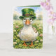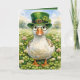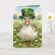A goose stands charmingly amidst a field of clover, wearing a vibrant green hat adorned with shamrocks. Its round glasses add a whimsical touch.