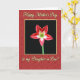 Designed with a rich floral theme, this greeting card centers on a single star-shaped flower set against a deep black panel, drawing the eye like a quiet gift of affection ❤️. The petals are deep red with thin white stripes that angle inward toward a bright yellow-green center, where fine stamens add a soft, intimate detail. Around that central panel, a warm ruby-red background shows a faint pattern of tiny star-like blossoms, creating a gentle, companionable backdrop. A slim yellow border frames the black center like a neat window, adding contrast without feeling harsh. Near the top, “Happy Mother’s Day” appears in flowing gold lettering, placed above the flower so it feels like a warm greeting being spoken. Near the bottom, “to my Daughter in Law!” sits in matching gold, balancing the layout and giving the message a tender, family-forward tone 🌼. The overall color pairing of red, gold, and yellow-green suggests closeness and appreciation through the way the elements lean toward the center. The black center panel is surrounded by a narrow yellow frame, and the outer red area is dotted with small, repeating floral shapes.