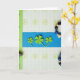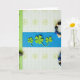 This card shows a tall layout with a cobalt-blue stripe running across the middle, where three green shamrocks sit side by side—two three-leaf clovers leaning in toward a four-leaf clover like close friends sharing a quiet moment 💚. Behind them, a light blue-and-white gingham background is sprinkled with faint lime-green floral outlines that feel like a cozy tabletop scene. Along the left edge, a wide lime-green vertical band resembles a binder spine, dotted with dark round eyelets and a small peek of a clip that adds a tidy, organized touch. On the right edge, a strand of beads drapes downward in glossy black, metallic blue, and textured beige, like an accessory left nearby after a fun evening out ☘️. The overall colors stay cool and fresh, with the greens standing out sharply against the deeper blue center. Any wording would sit neatly over the cobalt stripe in small white letters, centered beneath the shamrocks for easy reading. The beads catch the light in tiny highlights while the shamrocks remain flat and matte against the patterned gingham backdrop.