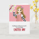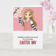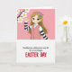 This card features a friendly illustrated person with large dark eyes and a bright smile, their golden-brown hair flowing under a pink headband topped with a fuchsia flower 🌷. They wear a white collared shirt layered with a rose-toned knit vest and a black-and-white striped long-sleeve, giving a cozy, put-together look. A slightly raised left hand reads like a gentle hello, as if they’re greeting someone they care about with an easy, affectionate warmth. The background is a soft blush pink that keeps the focus on the figure while adding a springtime glow. From the upper left corner, a slender branch curves inward with small white five-petaled blossoms and sunny yellow centers, framing the scene like a quiet bouquet. Along the bottom, a white rectangular panel holds the message in dark lettering, “Sending you wishes your way for a very happy,” leading the eye toward the holiday greeting. The final line, “EASTER DAY,” is set in red and stands out strongly on the white panel, with a little 🐰 feeling implied by the seasonal palette and flowers.