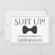 Utilisez cette "carte de proposition de toiletteur" pour demander à vos amis spéciaux et aux membres de votre famille d'être un toiletteur à votre mariage. Il présente une image d'une cravate à arc noir et dit : Suit Up! Vos services sont demandés en tant que Groomsman" Il y a un espace pour entrer une note spéciale demandant "Serez-vous mon groomsman?" ainsi que les noms du couple mariage et la date du mariage. Tous les champs sont entièrement personnalisables.
