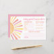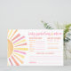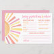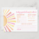 Cette carte horizontale prédictions et conseils pour bébés présente un design lumineux et joyeux sur le thème du soleil. Sur le côté gauche, un grand soleil avec des rayons vibrants dans des tons classiques de jaune, orange et rouge ajoute une touche chaleureuse et ludique. Sur la droite, les invitations de la carte doivent remplir leurs meilleures devis pour l’arrivée du bébé, y compris la date, l’heure, le poids, la couleur des yeux, la couleur des cheveux, et à qui ressemblera le bébé. En bas, il y a un espace où les clients peuvent partager un petit conseil pour les parents à venir et signer leur nom, ce qui en fait un doux saké après la douche. Le dos est doté d'un arrière - plan rose doux, mais vous pouvez le changer en n'importe quelle couleur pour correspondre à votre thème de baby shower. Entièrement personnalisable, cette carte est une activité ludique et réfléchie qui ajoute une touche personnelle à votre célébration.