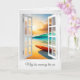 Fenêtre blanche ouverte avec rideaux et planches de surf sur le sable de plage avec vague d'océan pour la sympathie générale. Tout le texte peut être modifié.
