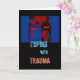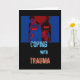 Contactez quelqu'un qui a besoin de votre compréhension et de votre soutien. Un message sobre mais positif est évoqué par ce design semi-abstrait dans des tons de bleu foncé, rouge et noir. Le graphique représente des jeunes hommes avec le mot « Guerre » sur leurs chemises comme « Faire face au traumatisme », qui est l'un des défis les plus extraordinaires et brutaux (physiques ou émotionnels) que les êtres humains peuvent avoir à affronter. Pourtant, pour ceux qui souffrent d'un traumatisme, quelle qu'en soit la source, le graphique a également une qualité édifiante - vous n'êtes pas seul et vous pouvez y faire face. Un fond bleu apaisant avec une version plus petite du même graphique est sur le devant de la carte à l'intérieur.