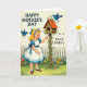 This design shows a retro-style scene centered on a young girl with golden curls and a flower crown, her rosy cheeks turned toward a small wooden birdhouse as if sharing a gentle secret ❤️. She wears a white dress with bright blue trim and bows, and her outstretched hand adds a sweet, friendly closeness to the moment. The birdhouse has a warm terracotta-colored roof and is wrapped with green ivy, making the setting feel cozy and cared for. Two blue birds bring a hint of romance and companionship—one perched on top as if waiting, the other nearby as if listening. Behind them, a white picket fence runs across the background, framing a garden packed with fuchsia, orange, yellow, and lavender flowers 🌼. The message “HAPPY MOTHER’S DAY to a Swell Sister!” appears integrated into the artwork, with the main line larger and the rest smaller beneath it in matching tones. The foreground is a rich green lawn sprinkled with blossoms, and the birdhouse sits slightly to one side with the birds highlighted in bright blue. Share your Mother’s Day sentiments with love and care.