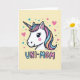 This card features the head of a gentle mythical horse-like creature, drawn in a simple graphic style with dark outlines and a sweet, friendly expression ❤️. Its face is bright white with big eyes, soft lashes, and a rosy blush that suggests a tender, affectionate mood. A flowing mane falls in neat pastel stripes of pink, pale blue, and warm peach, and the spiraled horn repeats those same soft colors. The background is a creamy yellow, giving the character a cozy, sunny setting. Scattered around are small hearts in blush pink and teal, along with tiny stars and dots that feel like little signals of caring and closeness 🌼. Near the bottom, the text “UNI-MOM” sits prominently, with “UNI-” in light blue and “MOM” in gentle pink, both edged in a dark blue outline. The hearts and stars float across the yellow field in matching pastel tones around the character’s head.