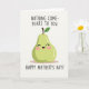 This greeting card features a friendly pear character centered on a creamy off-white background, drawn in soft green with a gentle highlight that makes it look rounded. The pear has rosy cheeks and closed, upward-curved eyes, giving it a sweet, affectionate expression that feels like a warm hug ❤️. A dark brown stem and a bright green leaf sit on top, adding a simple natural touch. Beneath the fruit, a muted pink shadow anchors it to the page without making the scene feel heavy. Across the upper area, the phrase “NOTHING COME-PEARS TO YOU” appears in a casual, hand-drawn sans-serif style in a dark tone, spaced to sit above the character. Near the bottom, “HAPPY MOTHER’S DAY!” is set in the same style and color, with the letters standing out clearly against the pale background 🌼. The overall layout stays uncluttered, with the pear aligned along the center vertical axis and the text balanced above and below it.