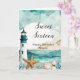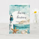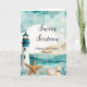Belle carte d'anniversaire sweet sixteen avec un phare noir et blanc nautique, étoiles de mer et coquillages. Parfait pour une fête d'anniversaire en sweet sixteen. Les mots peuvent être changés en fonction de vos propres détails ou exigences