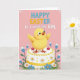 This greeting card features a bright yellow, fluffy little bird perched on a frosted cake, its wide eyes and rosy cheeks giving it a sweet, friendly look that feels like a gentle hello between close friends 🐰. The bird stands with wings slightly out, tiny orange beak open as if chirping, adding a light, affectionate energy to the scene. The cake is iced in white with a sunny yellow ribbon around the middle and a scalloped trim along the edge. Small white daisy shapes and scattered yellow dots decorate the sides, while two red, dotted candy-like treats sit on the top tier for contrast. Around the cake, clusters of blue and white flowers rise from leafy green stems, like a little garden gathered close as if for a shared celebration 🌷. The background is soft pink with a dashed white border and curled corner accents that frame the illustration. Near the top, a festive message appears in rounded lettering, mixing blue and yellow text so it stands out against the pink backdrop. Blue blossoms and green leaves sit near the lower edges, surrounding the cake like a floral border.