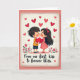 This greeting card shows a boy and a girl leaning in for a gentle kiss with their eyes closed and rosy cheeks. Between them, they hold a bright red heart, making the moment feel close and caring ❤️. The background is soft and light, with creamy tones and blush pink that keep the focus on the couple. Red hearts float around them in different sizes, like their affection is filling the air. The girl wears a red polka-dot dress and a matching red bow in her dark hair, and both characters have calm, content expressions. Near their feet, small red flowers and green leaves add a simple outdoor touch, and the whole picture sits inside a light stitched-looking border. At the bottom, the words “From our first kiss to forever bliss” appear in red cursive-style lettering, centered under the illustration. It feels meaningful to give because it says love can be sweet, steady, and lasting, and it’s a gentle way to share Valentine’s Day sentiments 🥰.