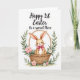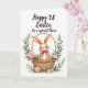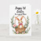 This card shows a long-eared bunny 🐰 in a soft fawn shade, tucked snugly into a woven wicker basket, with wide eyes and a small smile that feels like a tender greeting to someone close. A sweet pink bow at its neck adds a gentle romantic touch, like it was dressed up just for one special person. Curving around the basket is an arch of sage-green leaves, forming a cozy frame that draws your gaze back to the bunny’s calm expression. Scattered among the greenery are soft pink and creamy white flowers 🌷 with tiny golden centers, giving the scene a fresh springtime look. The background stays bright white, helping the basket’s weave and the bunny’s fur-like texture stand out without looking busy. Near the top, a short congratulatory line sits centered in flowing black lettering, clearly separated from the illustration below. The basket is shaded with warm browns and tan highlights, and the blossoms show pale petals with small yellow dots at their centers.