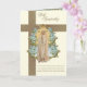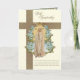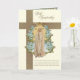 Avec une belle carte de condoléances funéraires sur mesure avec une image de la Vierge Marie, Notre-Dame de Fatima superposée sur une croix dorée. À l'intérieur se trouve la même image avec un verset des Écritures et une bordure florale bleue.