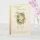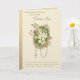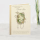 Comprend une belle carte de sympathie funéraire sur mesure avec une image du Saint Rosaire et un élégant bouquet floral blanc et or.