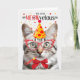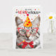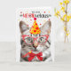 Cet adorable tabby en argent est habillé pour une grande fête d'anniversaire en pois rouge, blanc et jaune, puis jumelé avec des voeux d'anniversaire MEOWvelous.