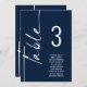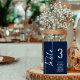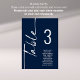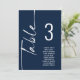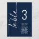 Script Marine Numéro de table blanche Noms de siège Graphique. Modifiez le numéro de chaque table et ajoutez-le séparément à votre panier. Même design de part et d'autre, utilisé pour un affichage suspendu afin que les clients puissent trouver leur siège ou sur chaque table. En bleu marine classique avec écriture blanche. Personnalisez facilement le numéro de table et vos noms d'invités. La même conception est de part et d'autre et se met à jour simultanément lorsque vous changez les mots en votre propre nom.