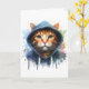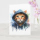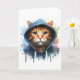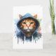 Œuvre d'art en éclaboussure d'aquarelle représentant un adorable chat tigré orange aux beaux yeux verts habillé d'une capuche sur cette carte de vœux vierge.