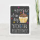 Illustration d'un tableau noir de café avec des mots blancs, des étoiles bleues, jaunes, vertes, roses, oranges et rouges, et d'un cupcake avec une bougie. La bougie sert de i in Special. Cette carte est de style moderne. Image numérique de papier peint à la main. À l'intérieur : Joyeux anniversaire