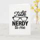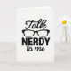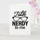 This card has a romantic theme with a warm and inviting feel. The design features the words "Talk NERDY to me" in a mix of fancy and bold letters on a simple white background. The word "Talk" is in a fancy script, while "NERDY" stands out in big block letters, with classic black glasses underneath. The phrase ends with "to me" in the same script style as "Talk," creating a nice balance. The contrast between the dark black and bright white colors gives the card a sleek and modern look. Overall, the design celebrates intelligence and humor with a touch of charm. Perfect for sharing some love this Valentine's Day ❤️💌🍫.