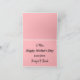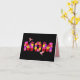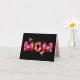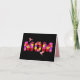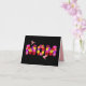 Belle carte de la Fête des Mères avec le mot MOM créé dans des fleurs aux couleurs vives. Avec des colibris roses girly qui se nourrissent des lettres florales. À l'intérieur de la carte est rose, et vous pouvez customiser pour ajouter votre propre salutation. Au dos de la carte se trouve un autre colibri rose.