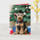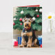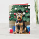 Terrier gallois mignon assis près d'un sapin de Noël et cadeaux de fêtes rouges et bleus