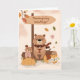 Une carte Thanksgiving douce avec une scène d'automne boisée cosy avec un ours en écharpe sirotant quelque chose de chaud, un renard enroulé en feuille, et une petite souris perchée sur un citrouille. Le panneau en bois indique "Salutations de grâces" pour une touche de saison douce. Avec ses couleurs d'automne douces et son ambiance de cottagecore boisé, cette carte est une façon attentionnée d'envoyer des voeux chaleureux, de la gratitude et un confort paisible à Thanksgiving.