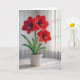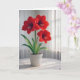 A red amaryllis plant with three large blooms graces a round table, softly illuminated by light filtering through sheer curtains.