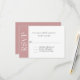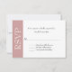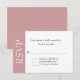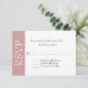 Élégante carte de réponse RSVP événement / mariage faite en blanc, sur le devant, avec une bande rose poussiéreuse, sur le côté gauche, avec grand texte blanc lisant RSVP. Le dos de la carte est un solide rose poussiéreux. Tout le texte est prêt à être personnalisé pour votre événement.